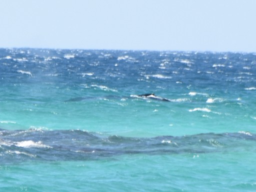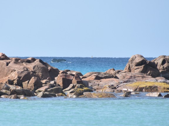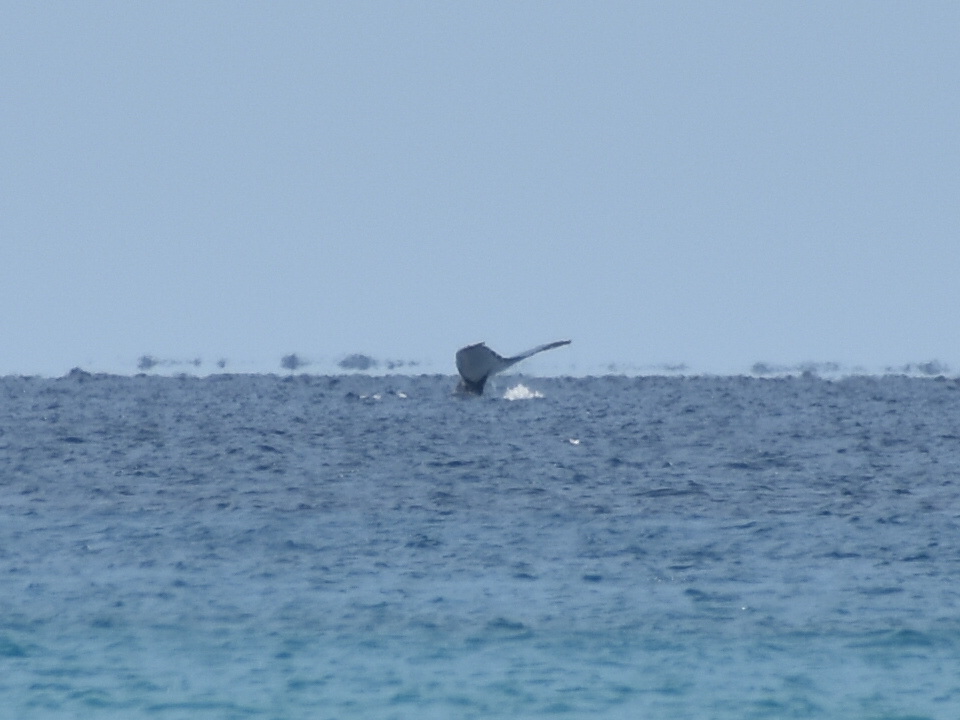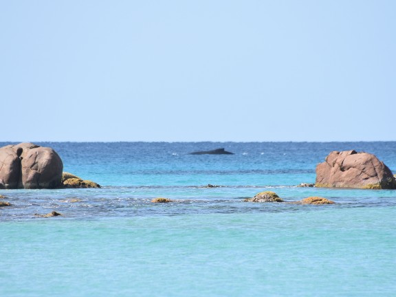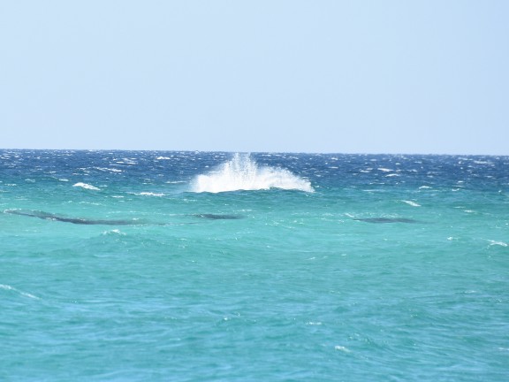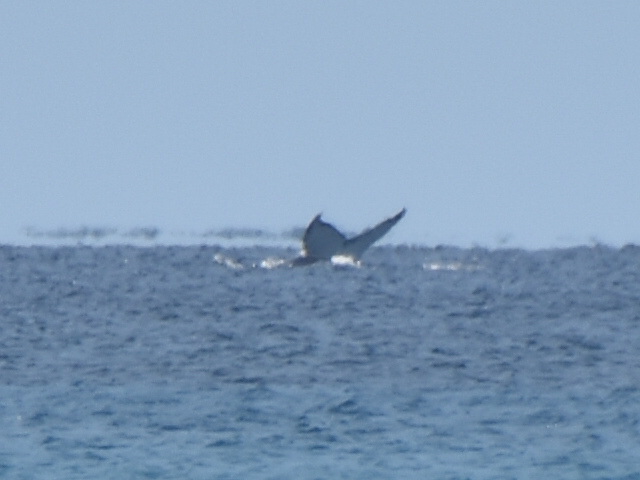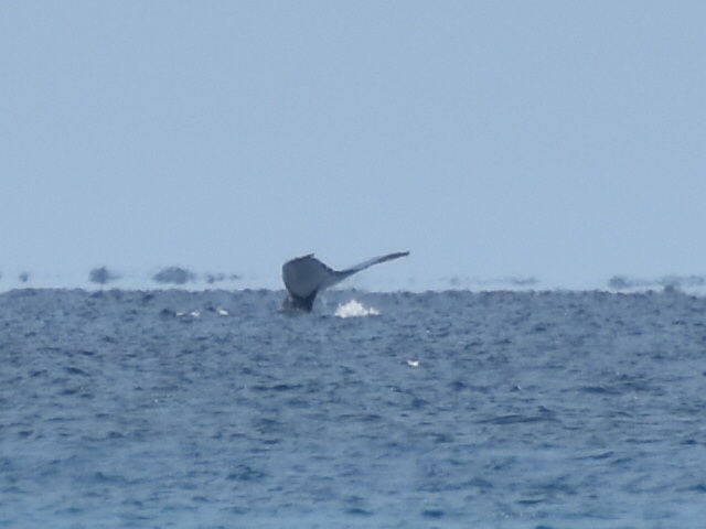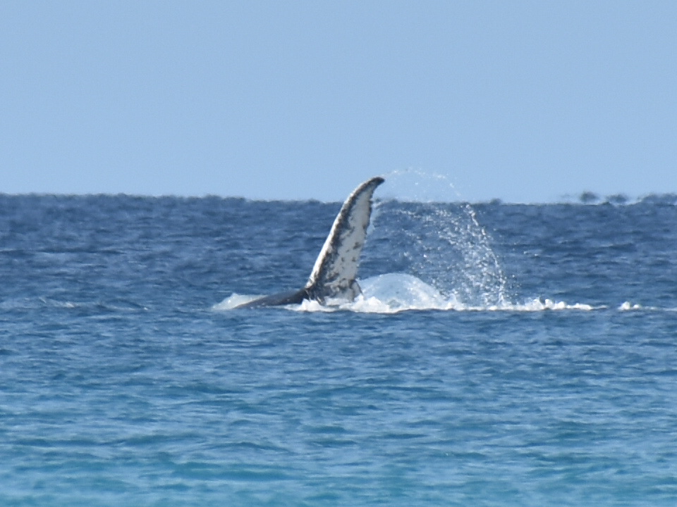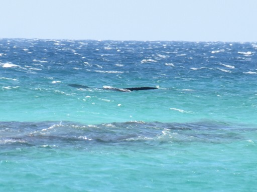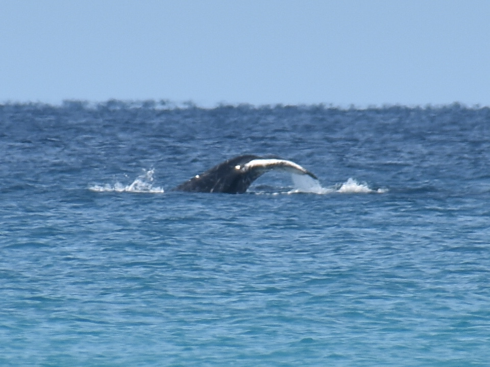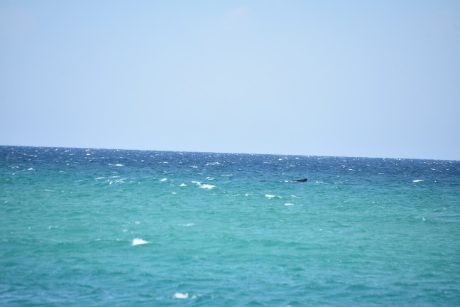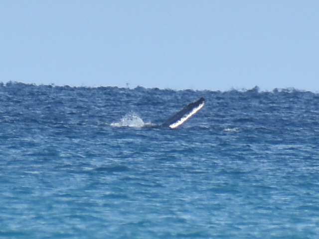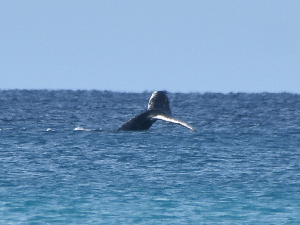 Aber das Highlight waren all die Wale, die zurzeit in der Bucht migrieren und dort mit ihren Kälbern herumspielen. Das sind Fotos von Buckelwalen. Die Flosse oben, sieht super klein aus, aber da ist ein riesiger Wal darunter.