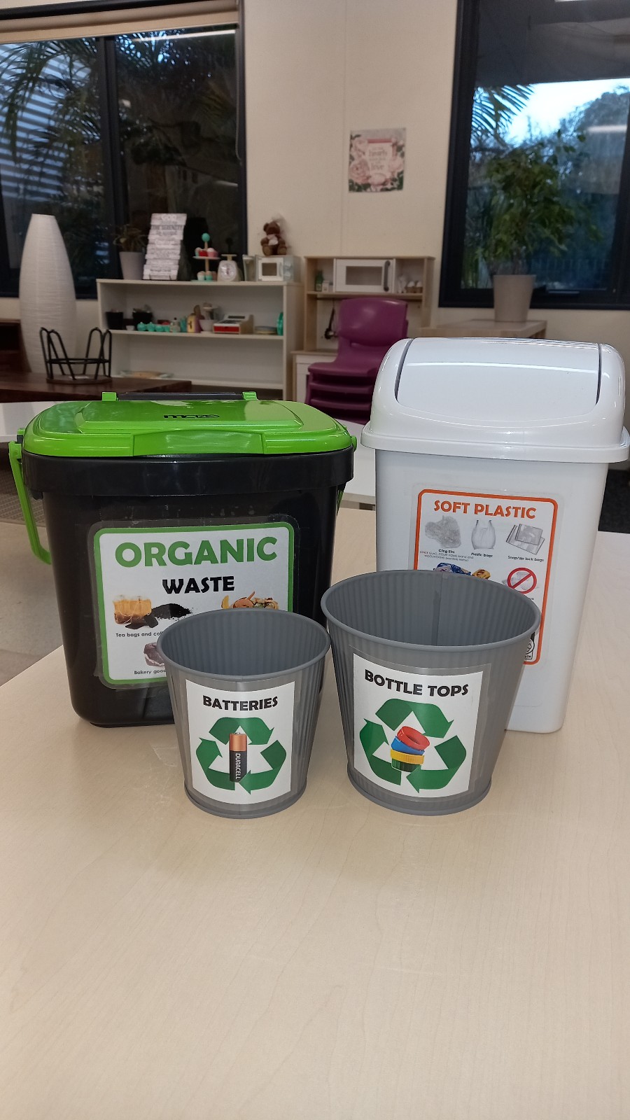 Am Mittwoch ging Nick mit den Kids in den Schwimmunterricht, denn ich musste dringend in die Schule. Wir wollen im 4. Quartal unser Nachhaltigkeitsprogram lancieren und das bin ich etwas am pushen, denn hier in Australien wird der ganze Müll einfach in der Erde verbuddelt. Und das sind Berge von Müll, was verhehrend für die Umwelt ist. Woolworth hat uns Kübel gesponsort so dass wir jetzt Softplastic vom Rest trennen können. Auf Batterien werfen hier die meisten in den Müll und Lebensmittel sowieso… Hier ist ein keines Set, dass von jetzt an in jedem Klassenzimmer steht.